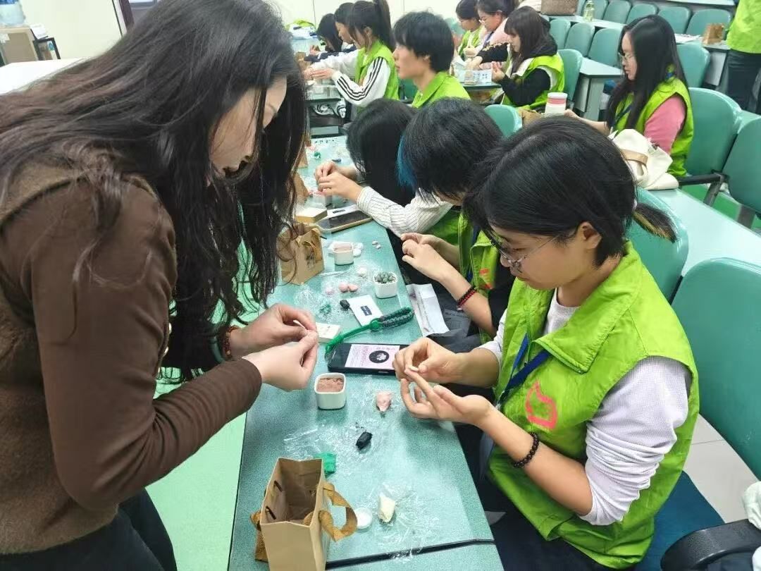 在邢老师的耐心讲解下,志愿者们将“一排,二团,三变”的面塑口诀熟记于心,用不同颜色的面团捏造形式各样的多肉,更有同学将“水滴型”活学活用,捏出可爱的小兔子点缀在多肉盆栽旁。制作间隙,大家围拢着老师请教叶片堆叠技巧,互相比较手中“多肉盆栽”的萌态,活动室里满是面团的清香与欢声笑语。活动尾声,每位参与者都将自己的多肉面塑作品装入透明防尘盒,把这份指尖的生机记忆悉心珍藏。
