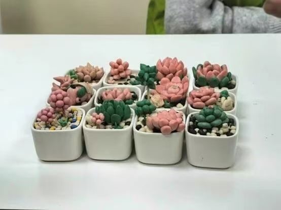 当天重点制作的面塑以形态各异的多肉植物为原型,寓意“生机盎然、蓬勃向上”,简单的叶片堆叠、基础的色彩晕染,易上手又有趣,新手也能做出萌态十足的作品。