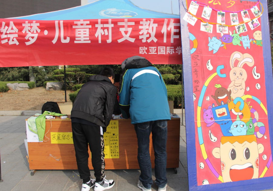 另悉,2016年11月24、25日,学院青年志愿者协会在大礼堂给SOS儿童村孩子们办了一个画展,将志愿者在支教过程中孩子们的优秀作品展示出来。纸张,彩笔,孩子们一笔一笔将他们心中的画画出来,每一张画都是孩子们的期待和童心。不仅如此欧亚青协还将孩子们的画印在明信片上售卖出去,所赚取的钱将捐献给SOS儿童村。在有百年韵味的河大大礼堂旁,孩子们的画用画板展示,让古色古香的大礼堂顿时活跃了起来。这次画展,孩子们画中的童趣如白鸽飞去四方,飞向每个人的心中,随两日后夕阳的余晖画展圆满结束。