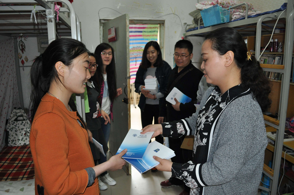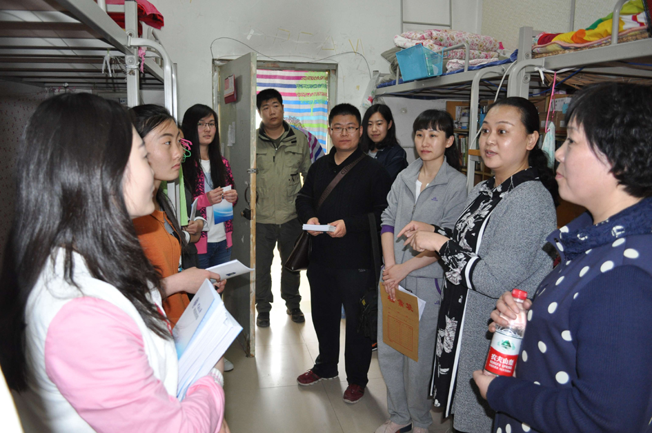 为深入贯彻全校安全工作会议精神,加强平安校园建设,全面深入推进麻豆三级片 学生安全教育,营造安全、稳定、文明的校园环境。2016年4月8日,校学生处副处长常凤香、学院党委副书记楚艳霞,在校园管理处、学院学生工作办公室相关负责人、辅导员及学生干部陪同下,走访了麻豆三级片 金明校区学生宿舍,发放安全手册,全面开展学生安全知识教育。