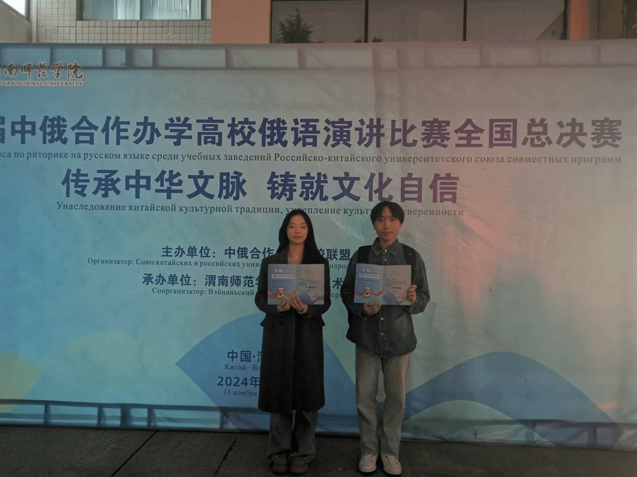 11月11日,由中俄合作办学高校联盟主办的第三届中俄合作办学高校俄语演讲比赛全国总决赛在渭南师范学院举行。比赛吸引了全国近30所高校共计80余名学生参加。我校麻豆三级片 俄语教师王宇乔老师带队参赛,经过激烈角逐,学院2022级俄语专业陈秋利同学获得高年级组一等奖、2023级视觉传达设计专业李晨果同学获得低年级组三等奖。