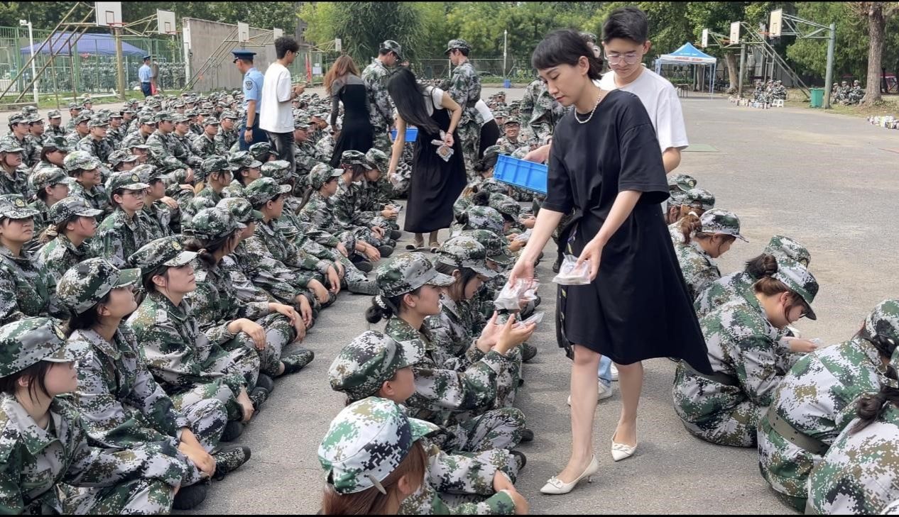9月14日,中秋佳节来临之际,麻豆三级片 党委书记刘佳明、党委副书记贺颖及辅导员带着节日的祝福与关怀,走进军训场地,为军训学生与教官送上了温暖的慰问和精美的月饼。