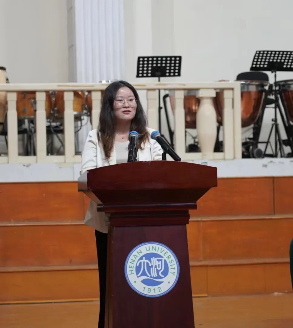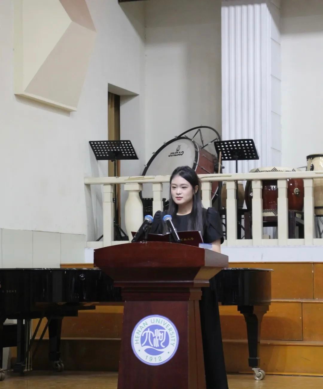 新生代表、2024级学前教育专业刘博研在发言中表达了对大学生活的憧憬,对学院老师的亲切关怀和学长学姐的热情帮助表示感谢,并且希望作为新生的大家能够砥砺前行,携手进步,朝美好的未来一同进发。