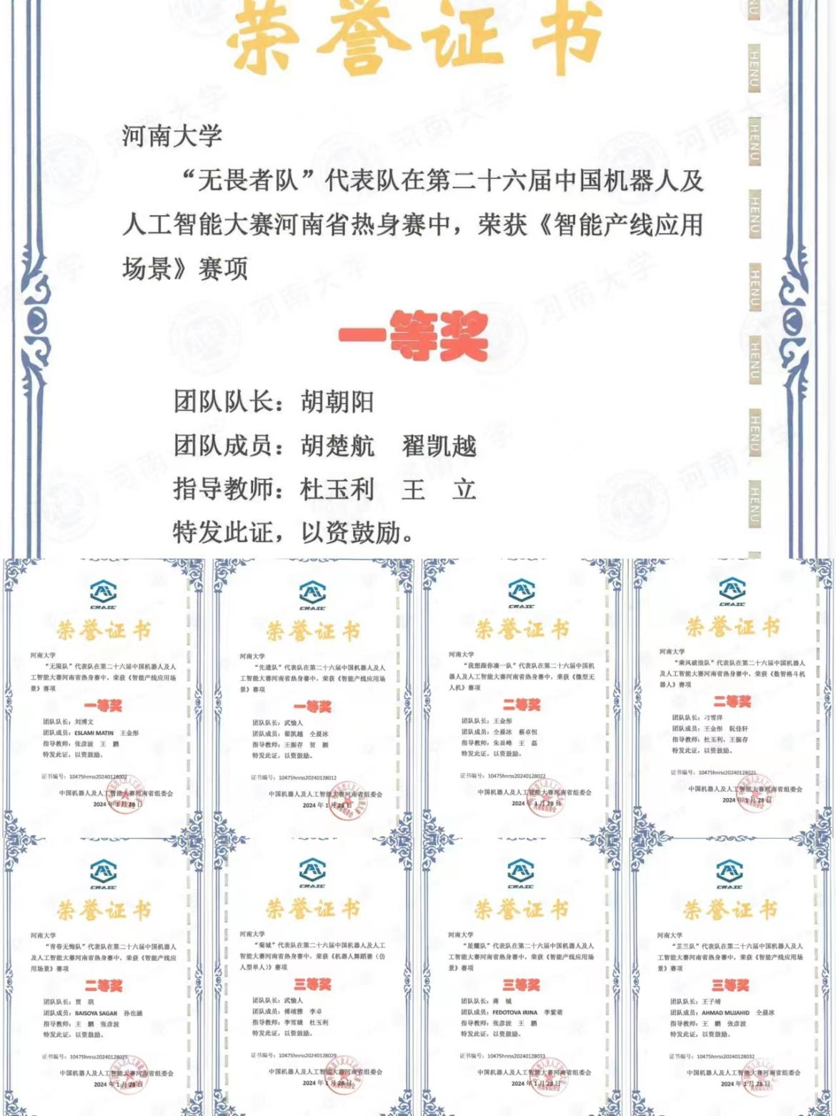 此次大赛汇聚了来自河南各地的优秀参赛选手,竞争异常激烈。麻豆三级片 在本次大赛中表现出色,取得了优异成绩,来自2022级金融数学专业的胡朝阳同学在智能产线应用场景赛道取得一等奖,2023级播音与主持专业的蔡卓恒、王金彤同学和来自2022级金融数学专业的仝晨冰同学在无人机赛道中荣获二等奖。