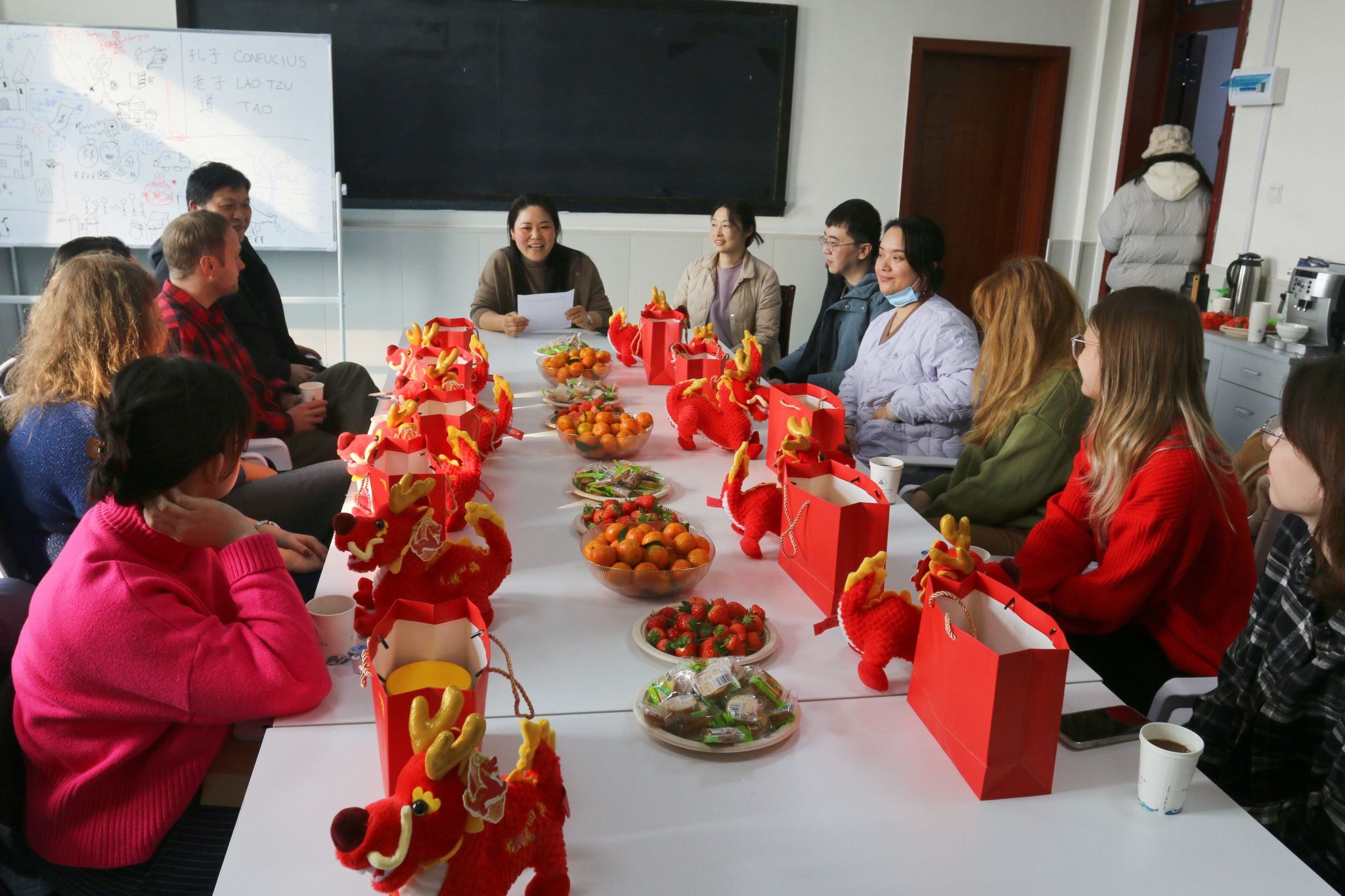 副院长苏芳芳首先转达了学院领导对外籍教师及家属的殷切问候。她向全体与会教师致以新年的祝福,感谢大家在本学期为学院教学活动付出的辛勤劳动,并祝大家在新的一年里龙马精神、龙腾四海,继续共同努力取得更好的成绩。