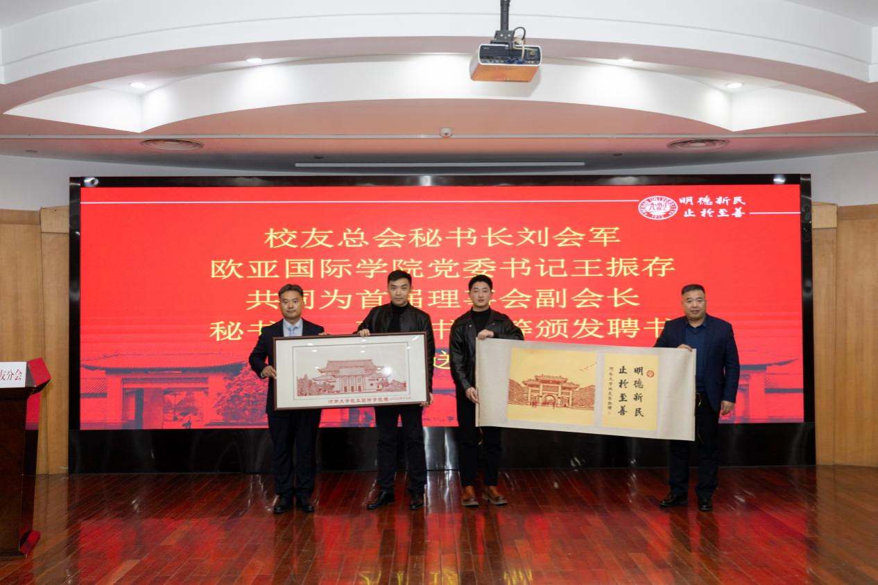 刘会军、王振存共同为理事会副会长、秘书长、副秘书长颁发聘书,并向校友分会赠送礼物。