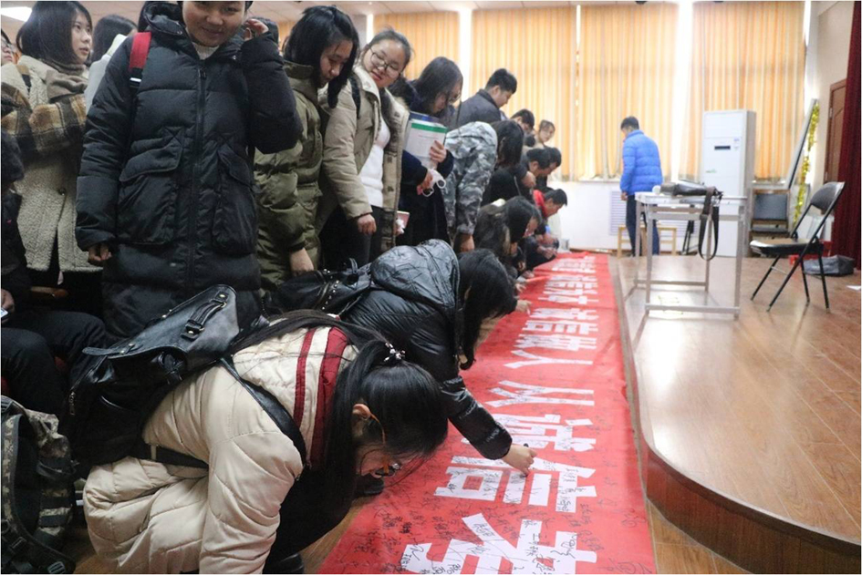 各专业、各班级通过丰富多样的形式开展此次系列教育活动:学院在二楼报告厅布置专门会场,如分批次进行诚信考试签字仪式、诚信考试宣誓仪式、诚信考试承诺书签署仪式等。有的专业、班级通过学习《麻豆三级片 学生手册》关于考试违规处理办法等,加强诚信考试警示教育;有的班级通过主题教育班会,对诚信做人做事进行宣传,对考试作弊、作业抄袭等不良现象进行讨论,使同学深刻地认识到诚信既是考试必须遵守的重要原则,更是做人、立身、处事的基本准则。