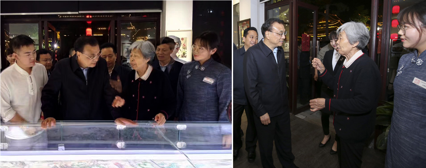 李总理在王素花汴绣艺术馆驻足时,亲切接见了国家非遗传承人王素花老师和艺术馆讲解员李娇同学等人。82岁的王素花多年继承创新宋代传统刺绣工艺,是汴绣领军人物。中国第一幅刺绣版的《清明上河图》就是在她的带领下绣制完成的。总理仔细观赏后称赞她用色“多而不杂”,技艺“炉火纯青”。他鼓励老艺人弘扬工匠精神,让优秀传统文化代代相传。