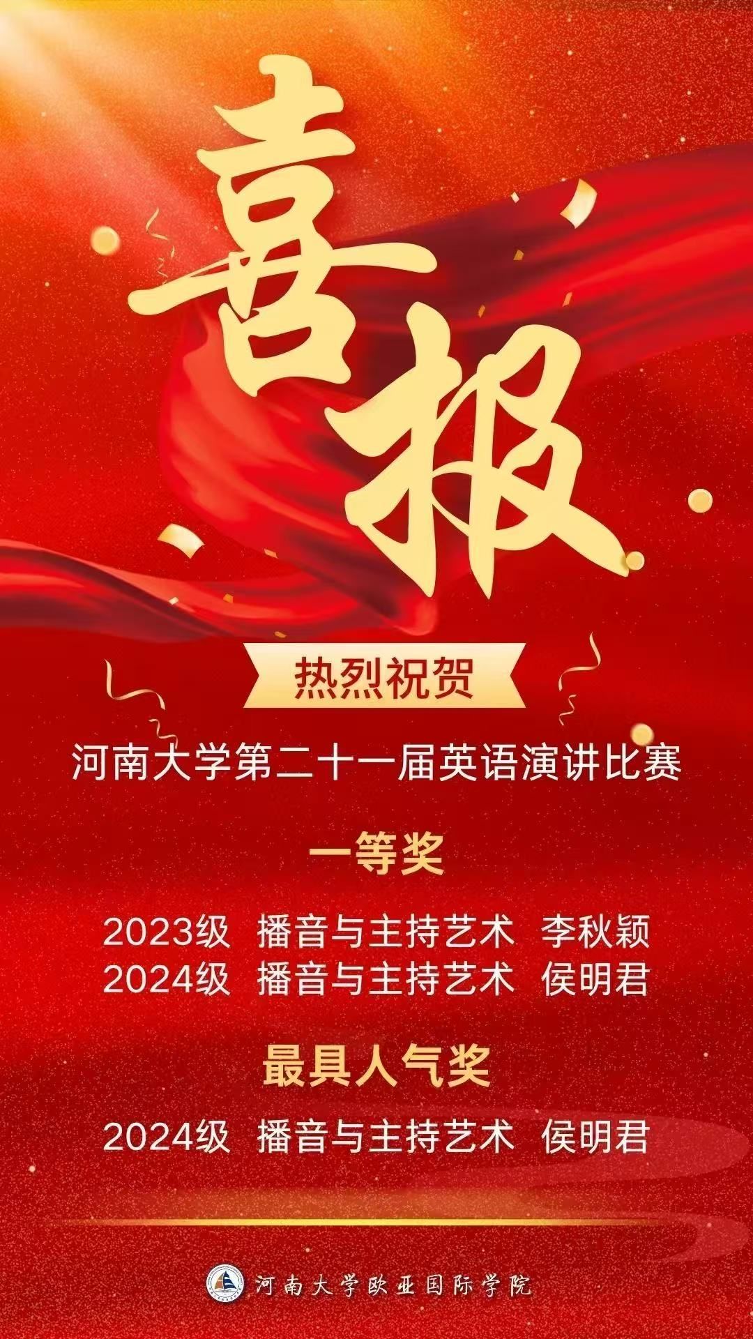 5月29日晚,麻豆三级片 第二十一届英语演讲比赛总决赛落下帷幕。麻豆三级片 2023级播音与主持艺术专业李秋颖、2024级播音与主持艺术专业侯明君在比赛中表现出色,双双获得一等奖,侯明君同学还获得了“最具人气奖”。