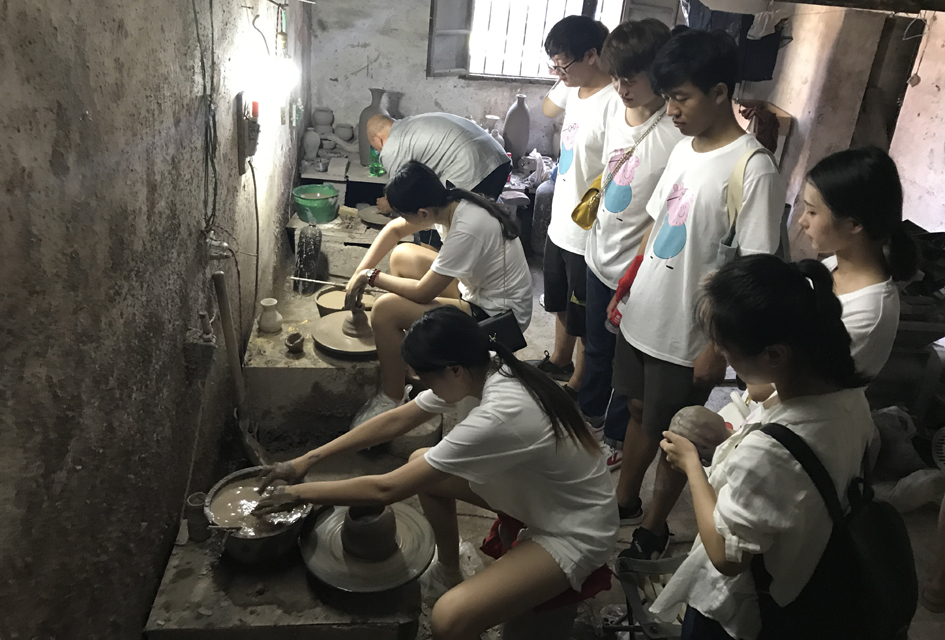 神垕地处伏牛山余脉群峰怀抱之中,四周环山,独特的地理位置和浓厚的历史文化孕育了神垕的钧瓷神韵。7日上午,师生们走进神垕镇陶瓷作坊亲身体验钧瓷制作工艺,在禹州钧瓷大师苗军喜的亲切指导下,苗军喜的孙子苗师傅的现场模拟教授下,师生们一一进行钧瓷技艺训练,从胚体成形、造型设计、拉胚成型的一系列过程,民间作坊流程看似十分简略、所造瓷品造型简单,但实际操作却十分讲究技艺和经验。团队成员们亲手制作了一件结构简单钧瓷胚体,却耗费相当于作坊苗师傅五倍的时间,有的还经历重复2次以上才做出一个雏形,经历此次作坊实践,大家对钧瓷的制作过程有了更深一步的了解,深深感受到了钧瓷文化的博大精深和“纸上得来终觉浅绝知此事要躬行”的深刻道理。