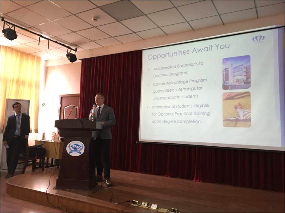 2016年10月18日下午,美国欧道明大学英语语言中心主任David Silvis在麻豆三级片 二楼报告厅为同学们做留学专题讲座,学院相关领导、辅导员、外事教师和2015级电子商务专业学生参加讲座。