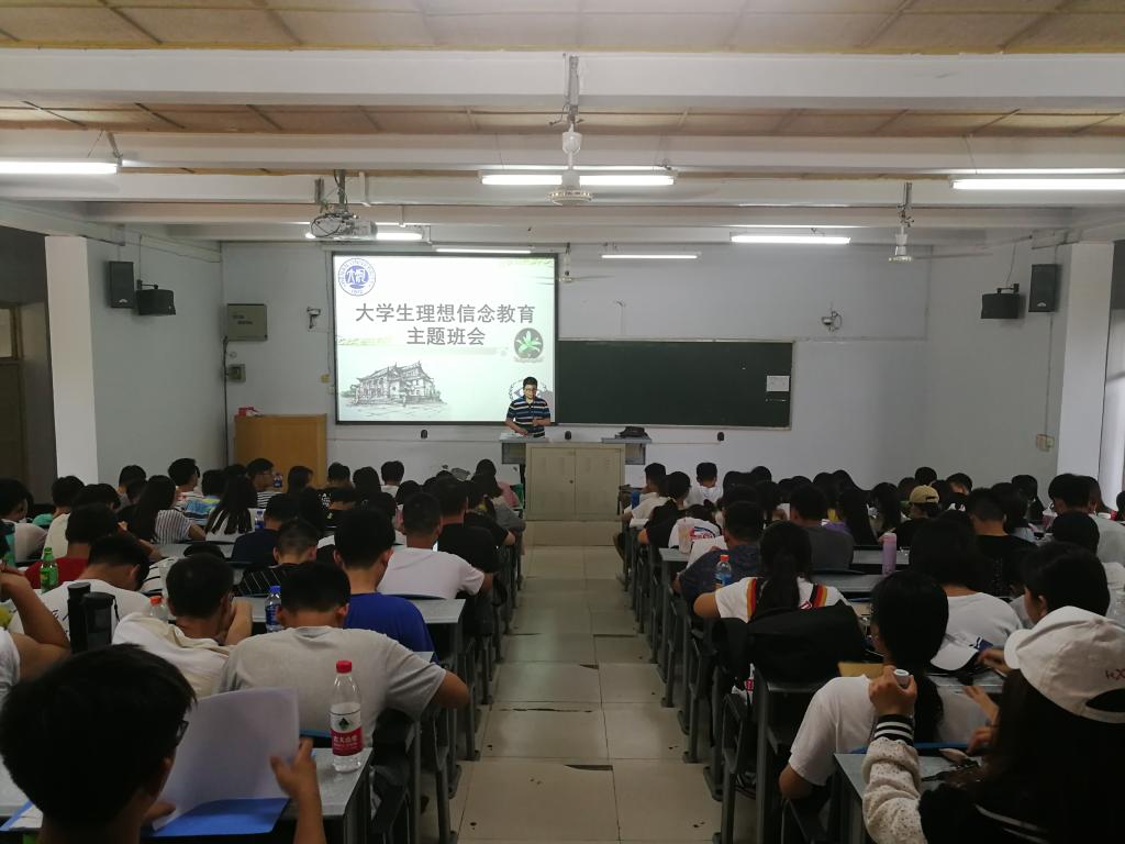 2017级电子商务和通信工程专业全体学生在明伦校区十号楼101阶梯教室开展大学生理想信念教育主题班会,主持人辅导员宿云龙。