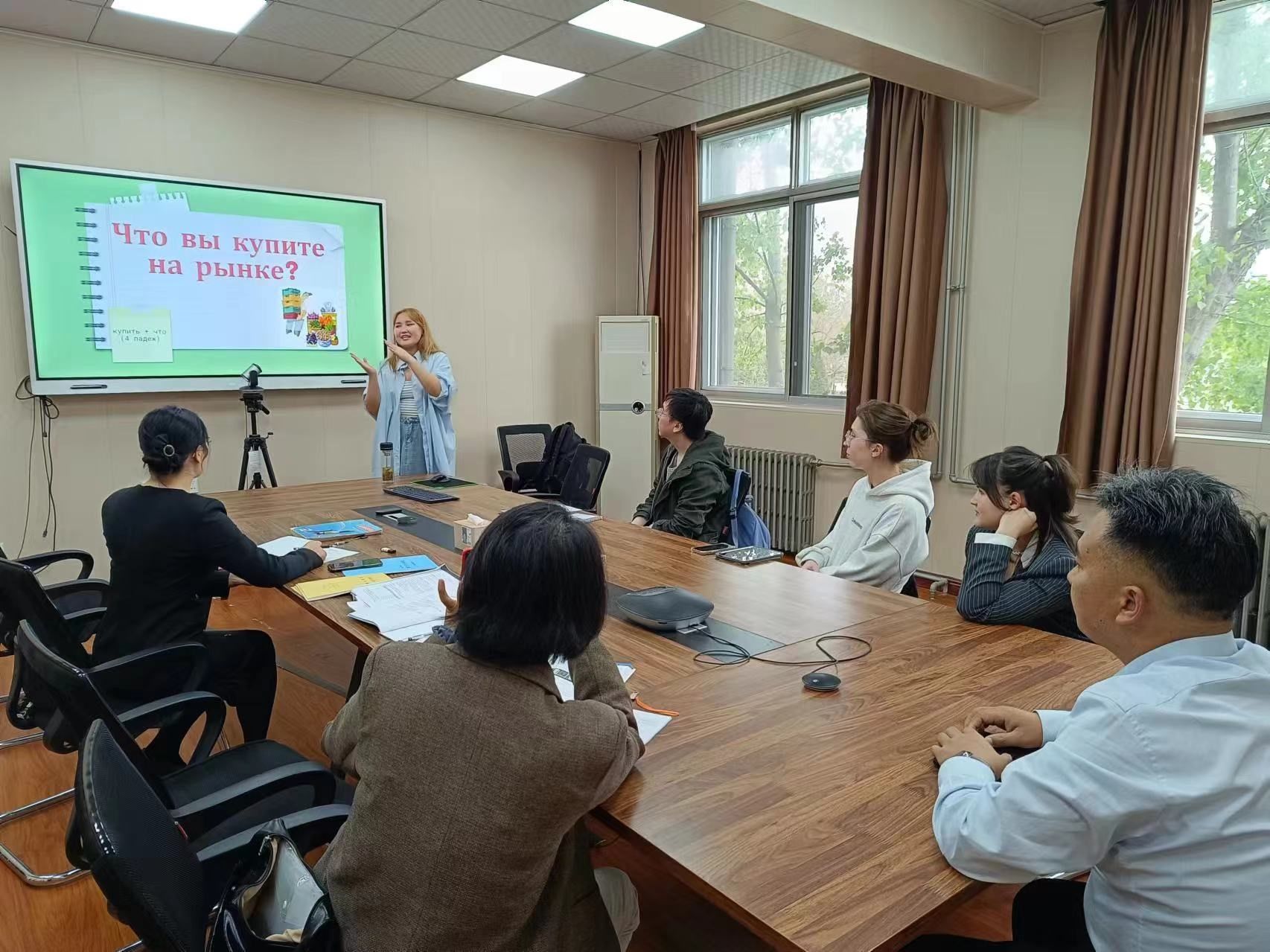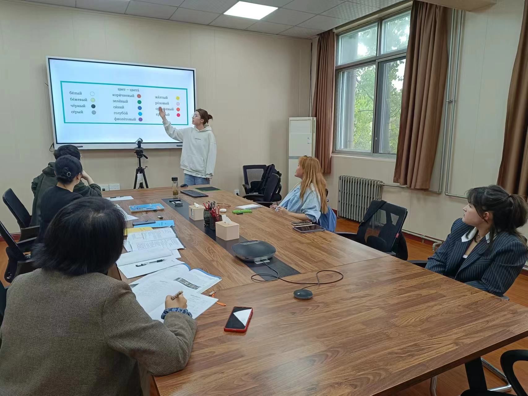 俄方Энкира, Дарья, Валерия三位老师对学院热情周到的管理服务工作表示感谢,并以饱满的热情积极参与本次教研活动。中方教师王燕、王宇乔、高筱、寇戎戎、高菲分别表达了对此次活动的期待,希望从此次活动中互相汲取宝贵经验,运用到自己的教学活动中。随后,每位教师分别进行了10分钟左右的课堂教学示范课。大家互相点评、深入交流,现场气氛热烈。