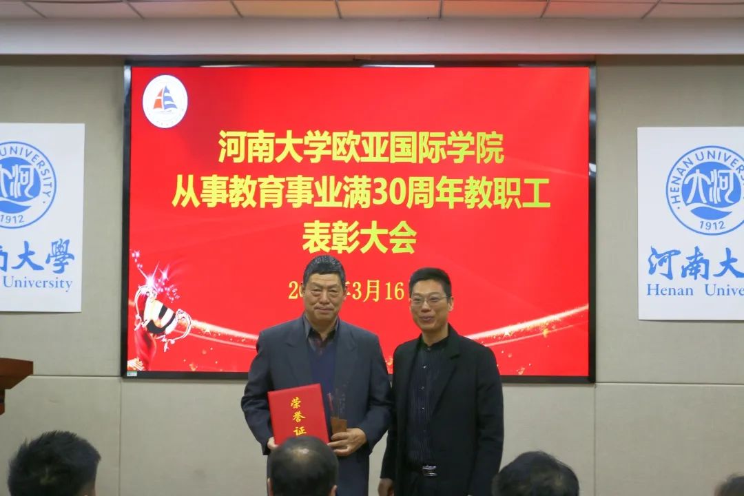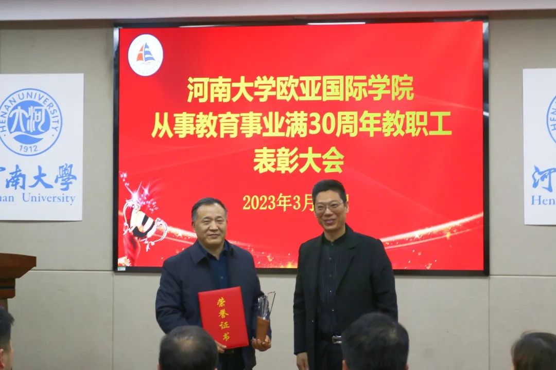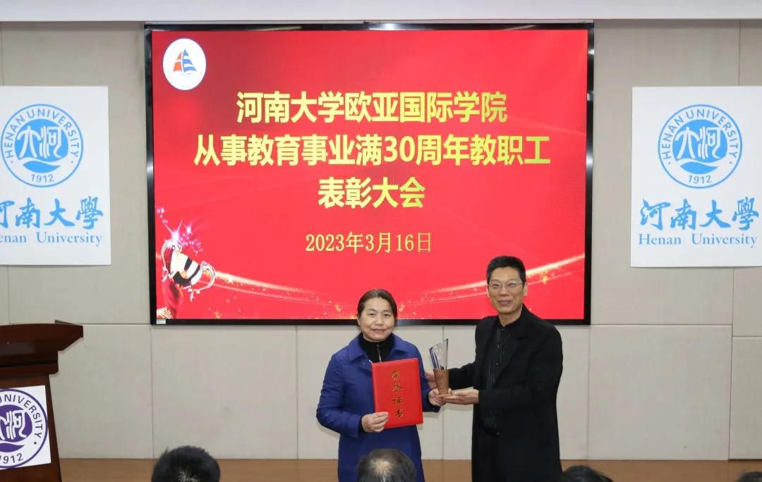 随后,在欢快的音乐声中,学院副院长、工会主席杨春伟为受表彰的老师们分别颁发从事教育事业满30周年奖杯和证书。