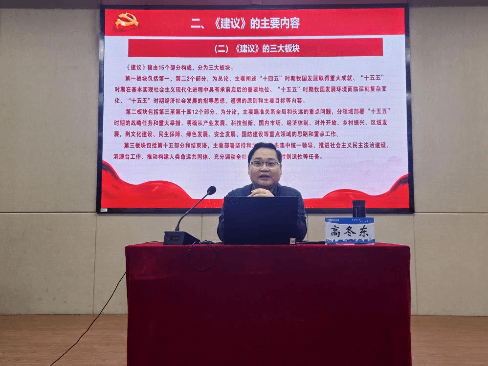 高冬东以《学习贯彻党的二十届四中全会精神》为题做专题辅导报告。报告从全会概况、《中共中央关于制定国民经济和社会发展第十五个五年规划的建议》主要内容、全会与教育相关的重点部署等方面进行展开;并结合“十五五”时期的战略定位、指导思想和主要目标,围绕学校发展目标,深入解读了教育强国、科技自立自强、人才自主培养等与高校发展密切相关的部署要求。