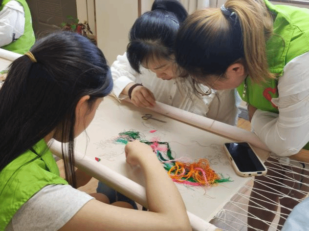 下午三点,活动正式开始,志愿者们在现场近距离观赏到精美的汴绣作品,随后他们在工作人员的带领下前往工作间体验汴绣制作过程。工作间整整齐齐排列着绣绷,志愿者们浏览并挑选心仪的花、叶图案和色泽亮丽绣线进行绣制,每个刺绣步骤都有专业老师在旁悉心指导。