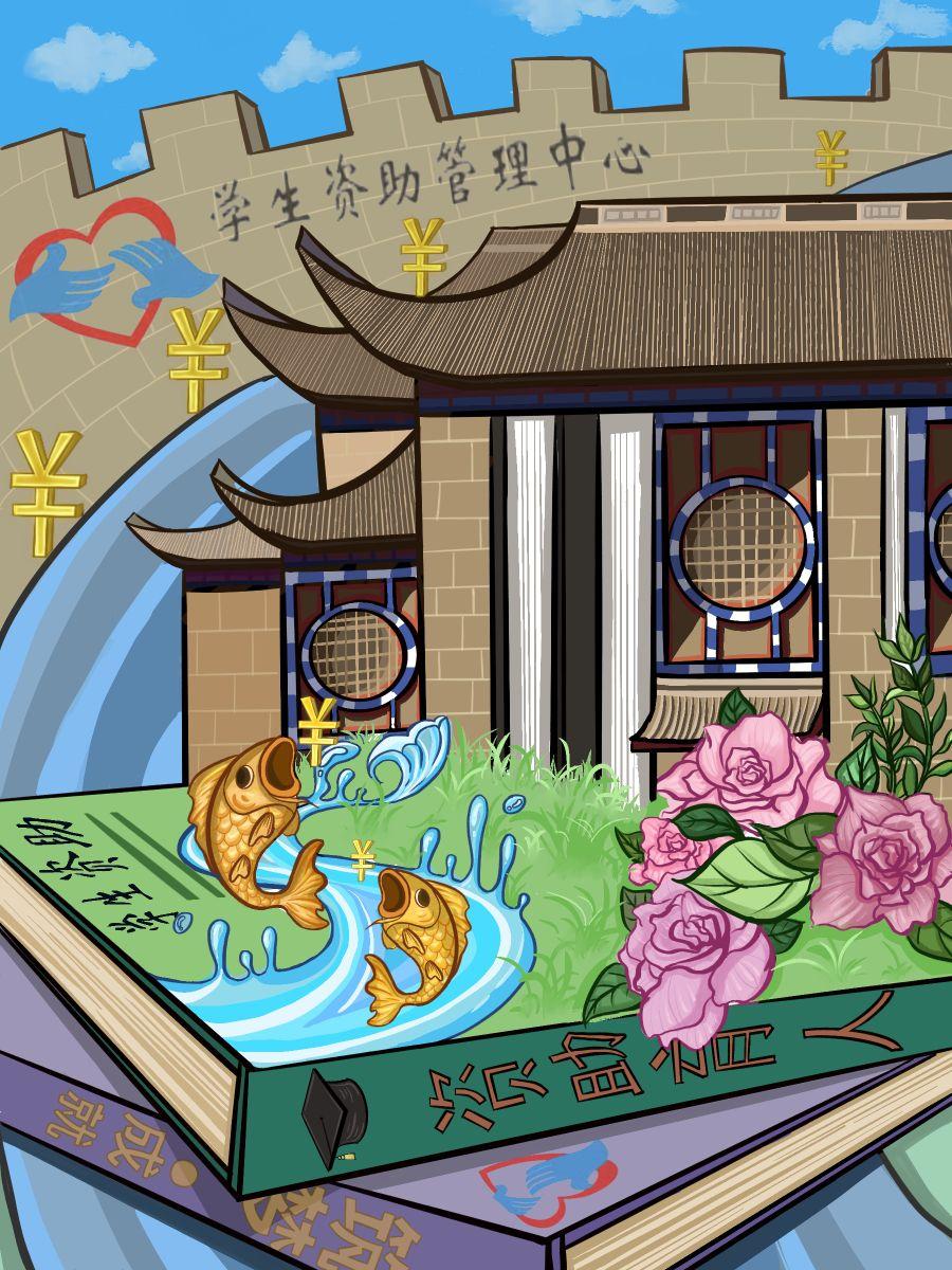 大礼堂、代表希望的锦鲤和生长旺盛的花草组成,背景由城墙组成,表达学生资助有利于实现教育公平,辅助学生实现人生价值,培养国家接班人。
