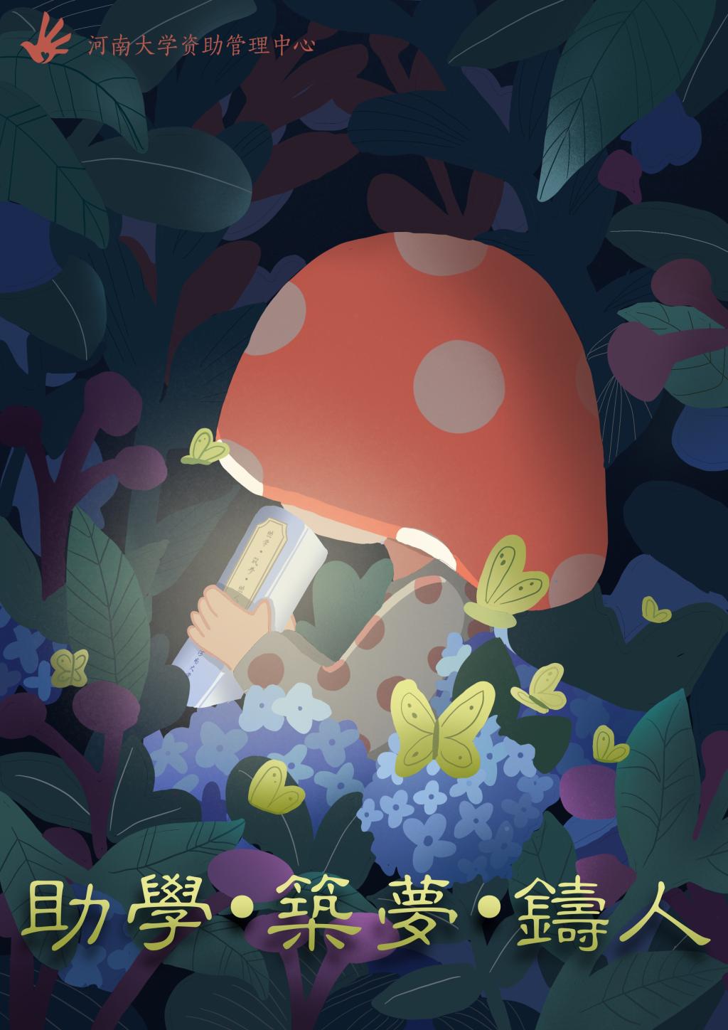 宣传画为自己为原型,手中拿着一本书闪闪发光,意味河大助学点亮的是我的梦想,让我从一个本该在地里的蘑菇形象通过助学来成长,绽放自己的光彩,迎着光而来的蝴蝶意味因为读书我获得的机会,表达了我的感激之情。