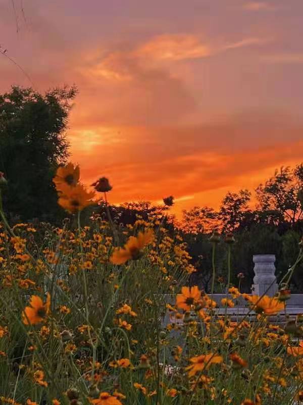 在夕阳下,路边的小野菊与天色融为一体,“不是花中偏爱菊,此花开尽更无花”,更为一天的疲倦带来了些许慰藉。
