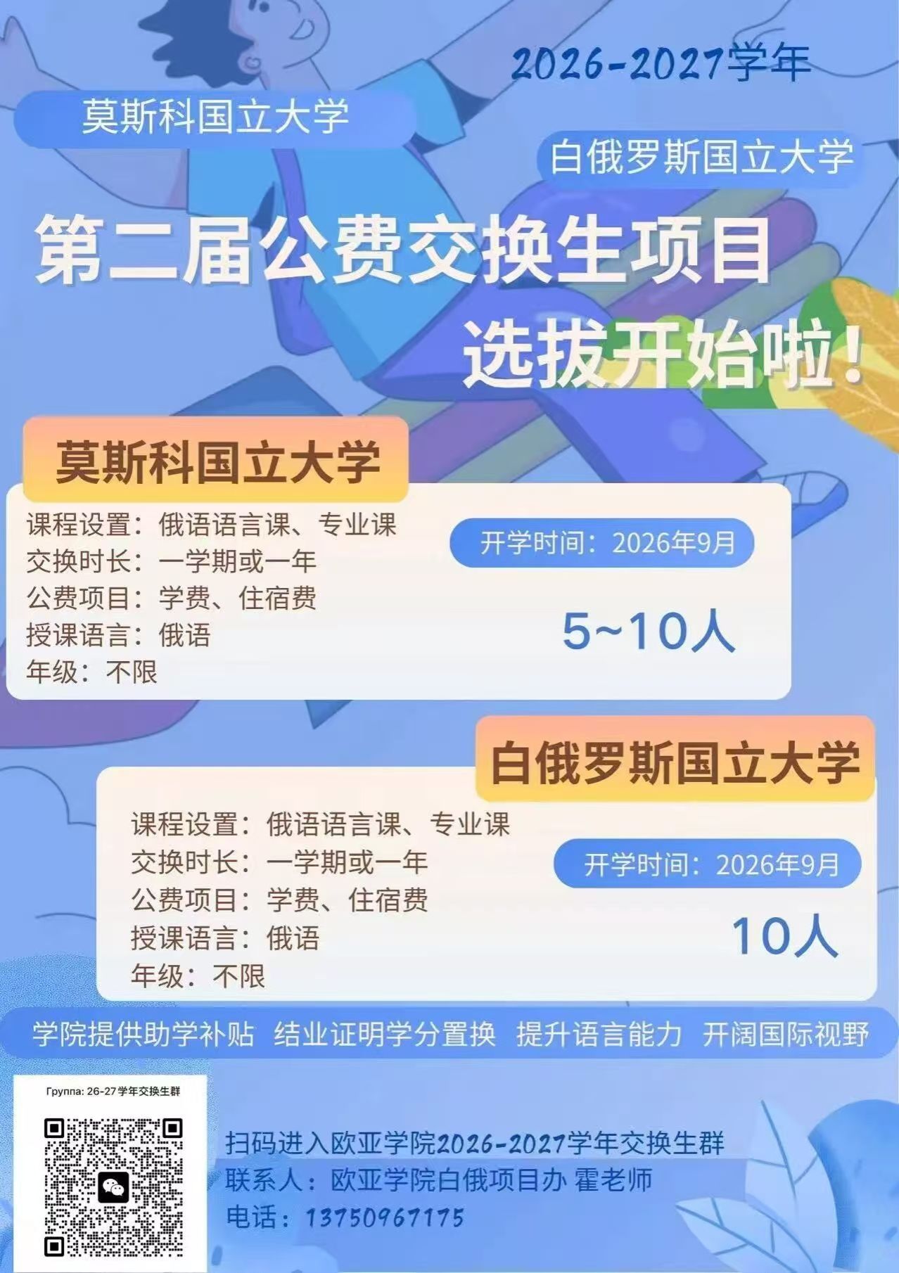 2026-2027学年莫斯科国立大学、白俄罗斯国立大学公费交流生项目报名选拔正式开启,麻豆三级片 本科2025级、2024级、2023级、2022级在读学生(专业不限)可报名参加。通过选拔后,可赴俄/白俄学习语言课程。本年度参加公费交换生项目的学生,学院将给予助学补贴。