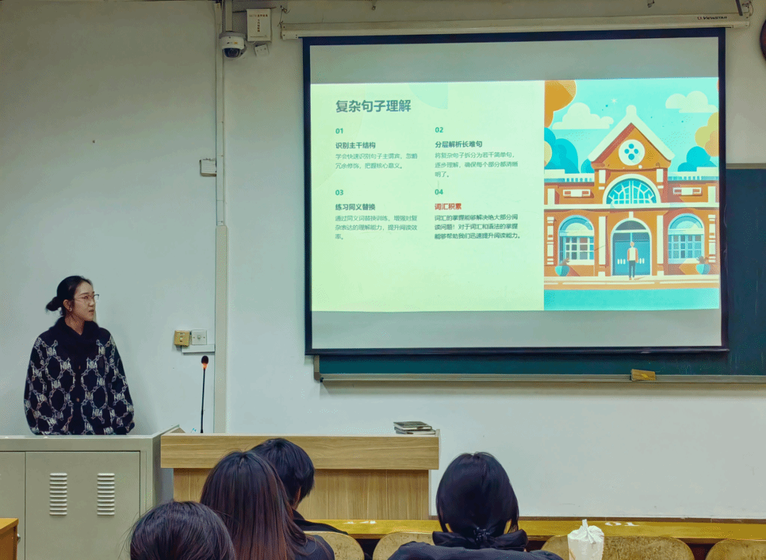 2022级金融数学专业王潇艺同学告诉我们专注的重要性,希望我们通过反复的记忆强化对单词的记忆,并分享了她十分赞赏的英语学习博主“烤鸭TV”学习博主,支持我们少看电影多听英语听力音频来提高我们的听力能力。她向我们讲解了考试中可能出现的问题,同时她鼓励我们放平心态,以良好的心态面对可能的问题,向我们表达了高分通过英语四六级的祝福。