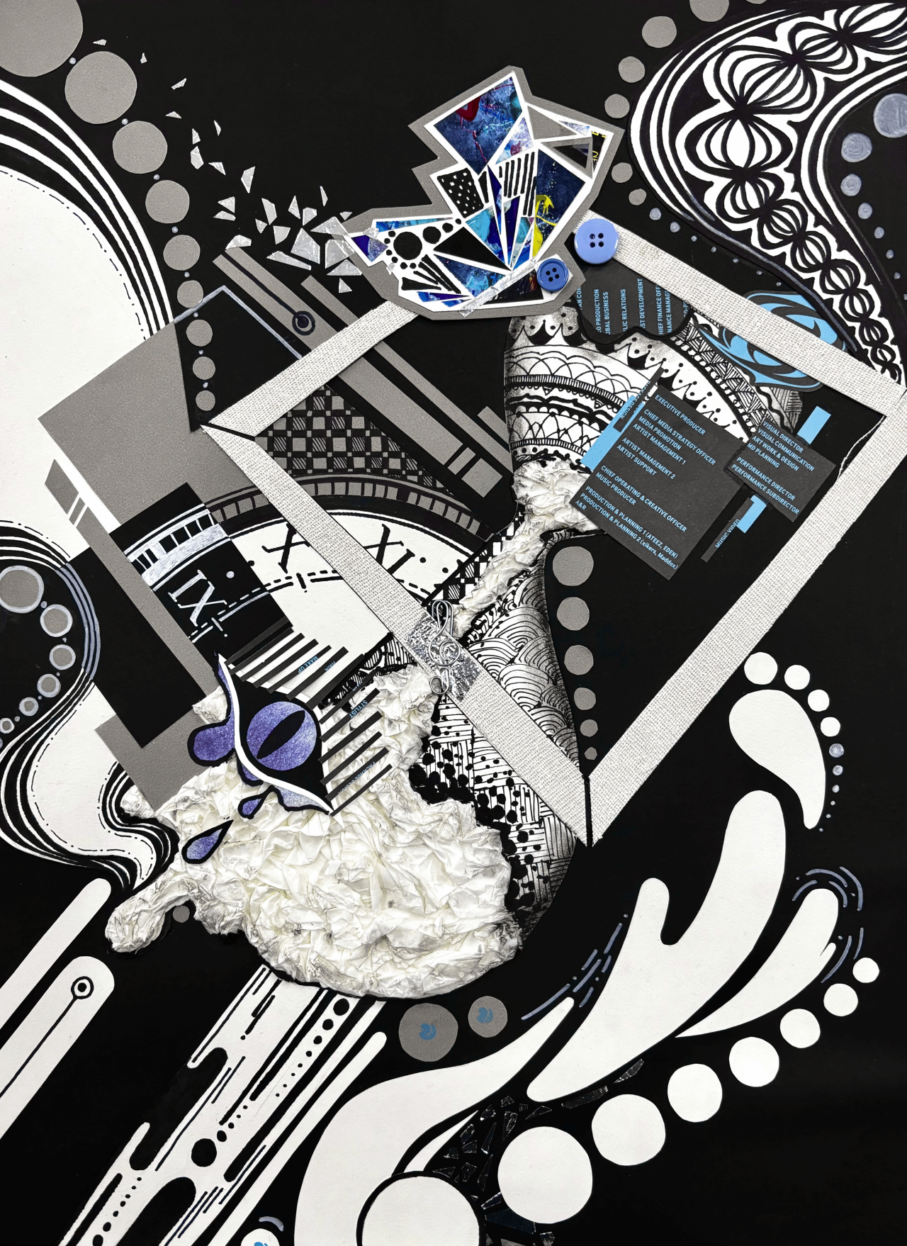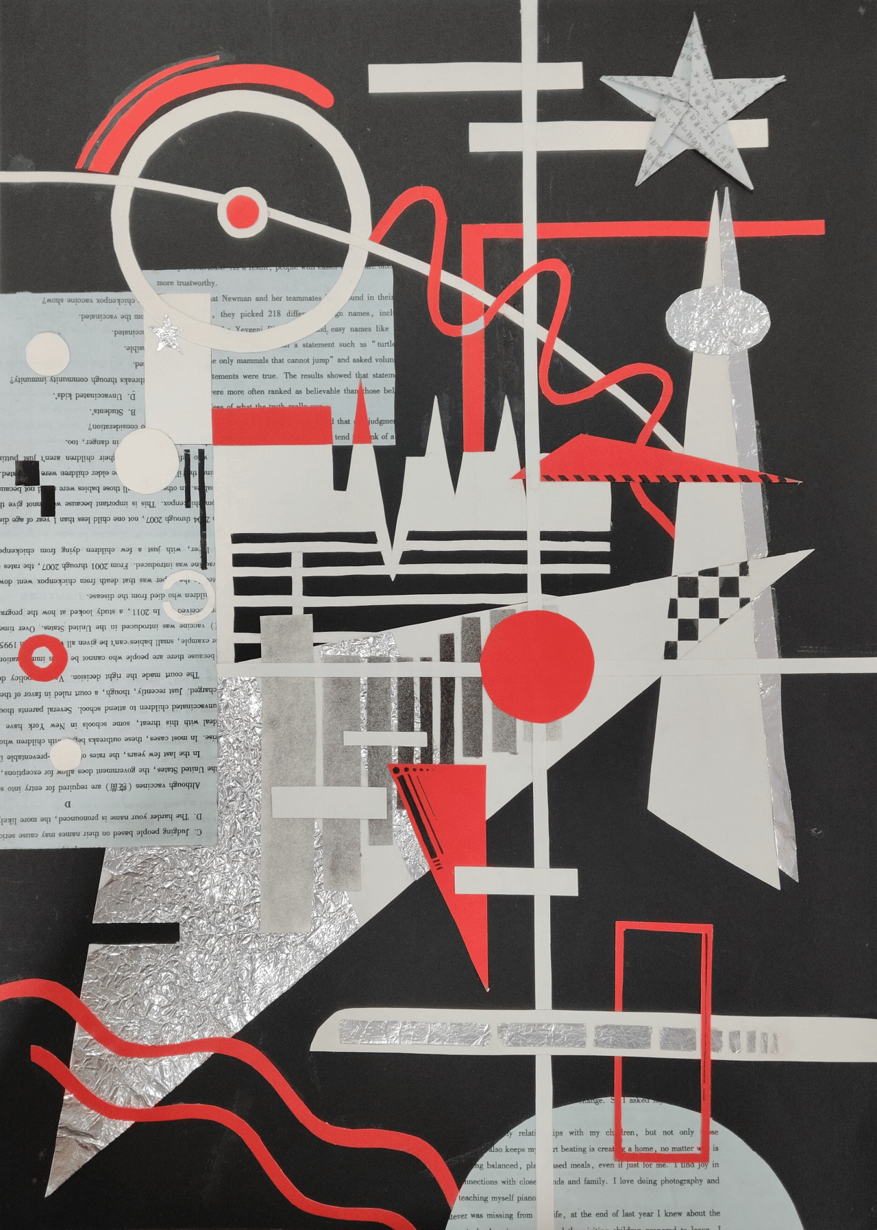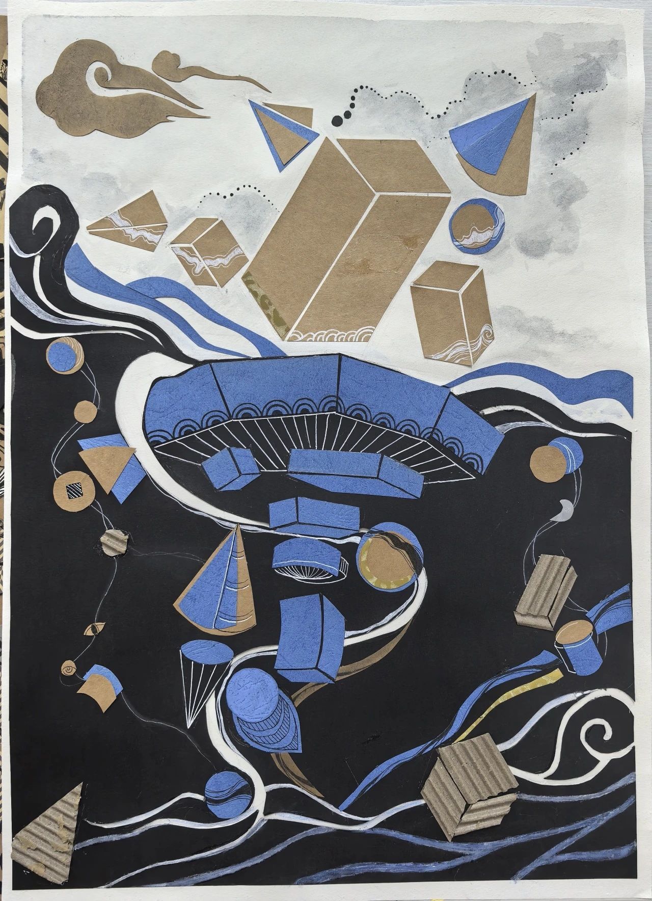 同学们运用各式各样的材料,通过剪裁拼贴的方法,学习借鉴大师作品,把所找到的素材结合自己的创新,用抽象的方式表达自己的所思所想与所感所悟。