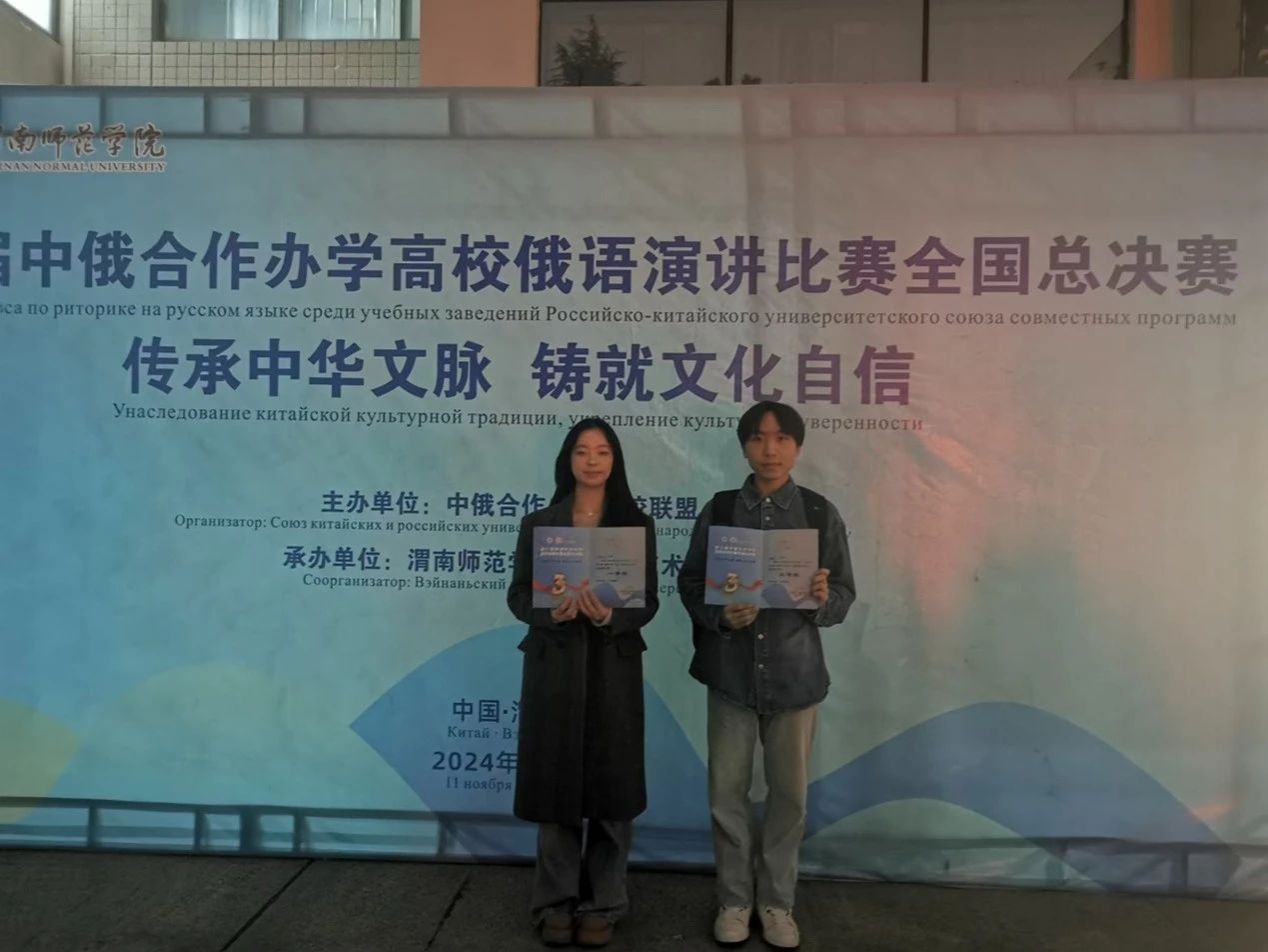 11月11日,由中俄合作办学高校联盟主办的第三届中俄合作办学高校俄语演讲比赛全国总决赛在渭南师范学院举行。比赛吸引了全国近30所高校共计80余名学生参加。我校麻豆三级片 俄语教师王宇乔带队参赛,经过激烈角逐,学院2022级俄语专业陈秋利同学获得高年级组一等奖、2023级视觉传达设计专业李晨果同学获得低年级组三等奖。