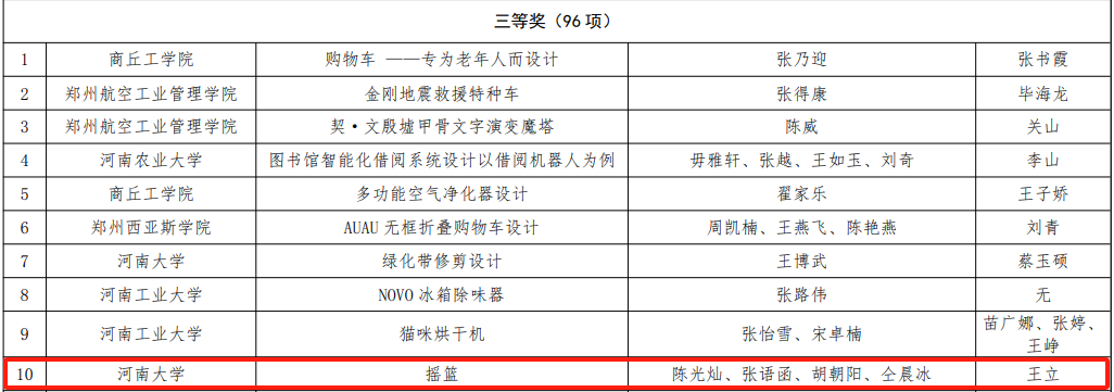 学生陈光灿、张语函、胡朝阳、仝晨冰组成的队伍“摇篮”荣获省级三等奖。