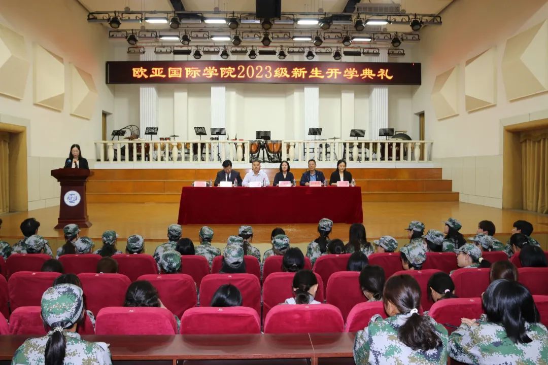 2023级俄语专业董沐言代表新生发言。她表达了大学生活的憧憬,对学院老师的亲切关怀和学长学姐的热情帮助表示感谢,并希望大家以超越自我的勇气、永不言弃的刚毅和从容自信的心态去拥抱逐梦路上的无限可能。