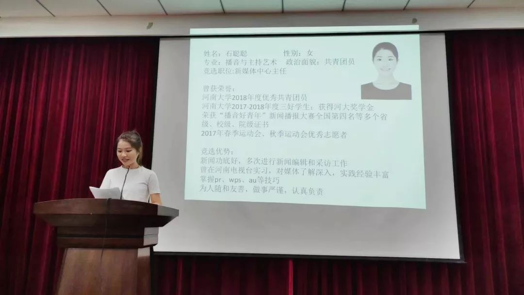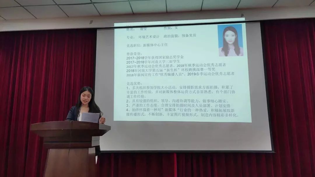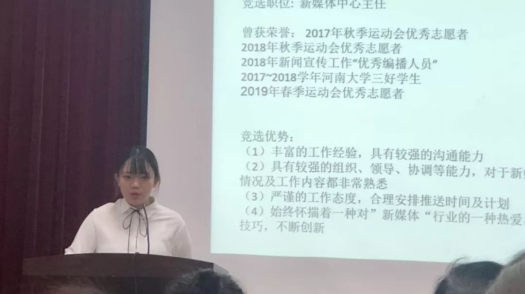 上午九点整,大会正式开始。首先是现任部长进行主任竞选演讲,已有两年丰富工作经验的部长们就工作总结、自身优势对新媒体中心发展提出建议并进行阐述分析,明确地表明了自己关于新媒体中心发展前景的想法以及成功当选后会做的努力,他们在答辩时从容镇定、思路清晰,将自己的想法进行了更具体的讲解,可以看出,部长们对于新媒体中心的了解非常深入。