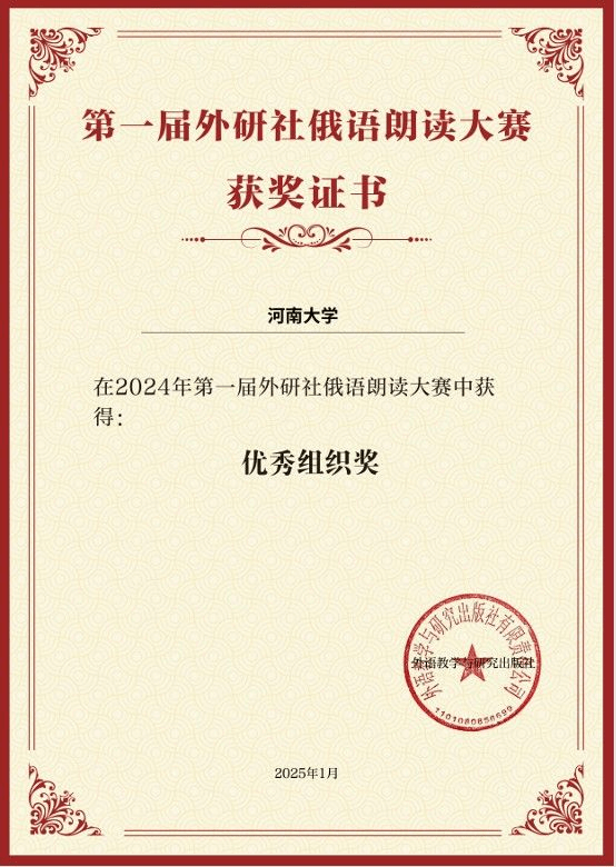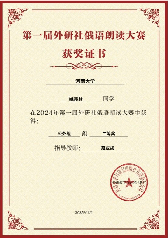 近日,由外语教学与研究出版社主办的首届全国俄语朗读大赛落幕。麻豆三级片 学子表现优异,2023级播音与主持艺术专业姚兆林、王佳悦两位同学分获公外组二等奖,陈嘉颖获优秀奖,我校获颁“优秀组织奖”荣誉称号。