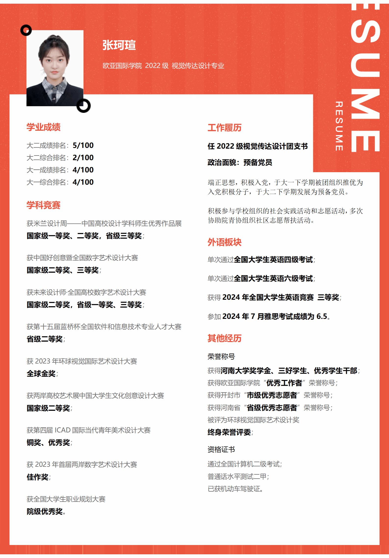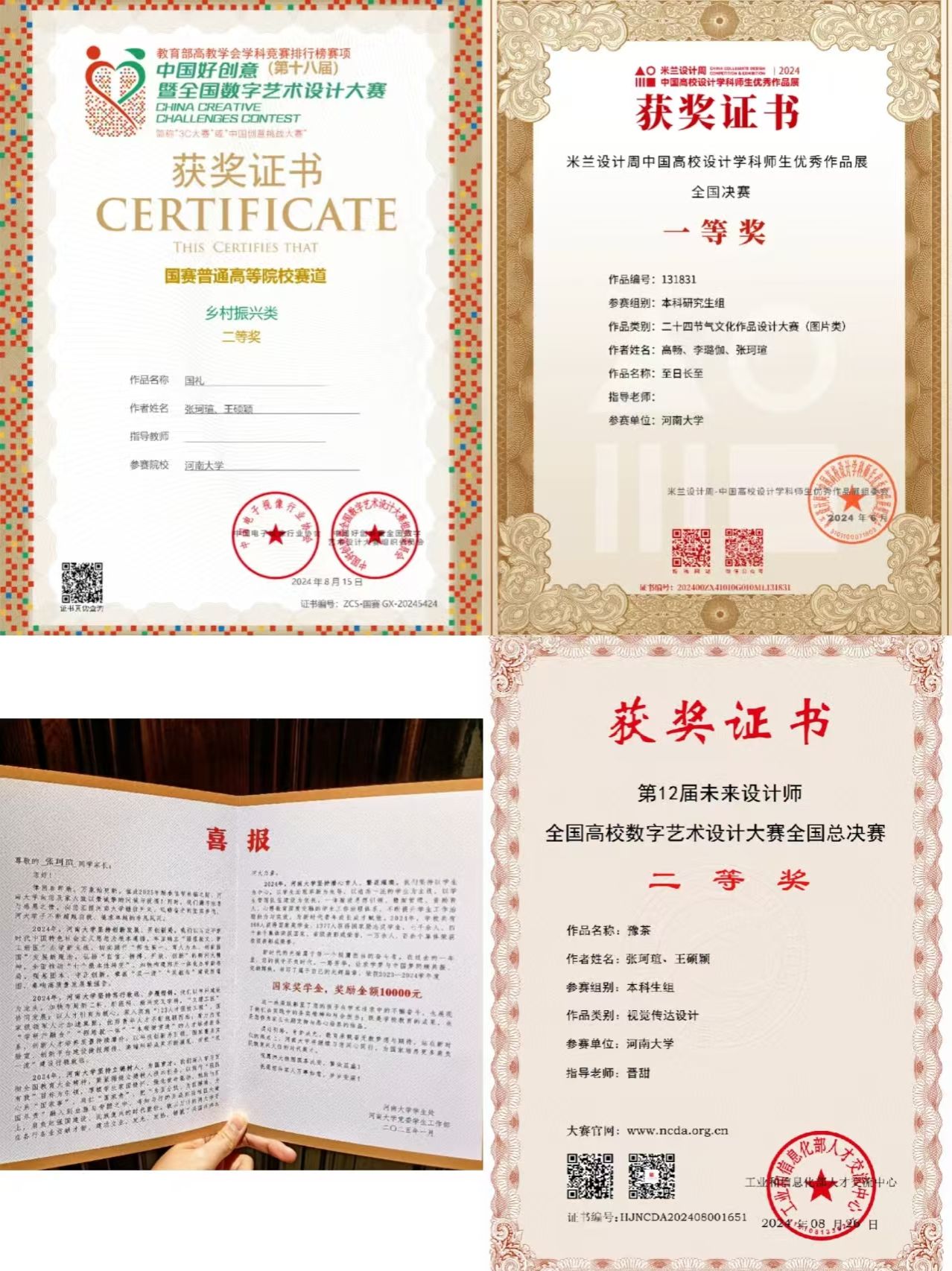 入校两年半,张珂瑄学业与综合成绩稳居年级前5%,连续两年获麻豆三级片 奖学金、三好学生等荣誉,还拿下2023 - 2024学年国家奖学金。她一次性通过英语四、六级,在2024大学生英语竞赛D类获三等奖,雅思首考6.5分,俄语成绩稳定95分以上。在学科竞赛方面,2024年她的作品《至日长至》获米兰设计周国家级一等奖,《福暖四季·拾味中点》获中国好创意大赛国家级三等奖 ,与同学合作的《豫茶》获未来设计师大赛国家级二等奖,还获多项其他奖项,因环球视觉国际艺术设计大赛获全球金奖,被聘为终身荣誉评委。她担任年级团支书并成为中共预备党员,协助组织参与志愿活动,获省、市“优秀志愿者”称号。